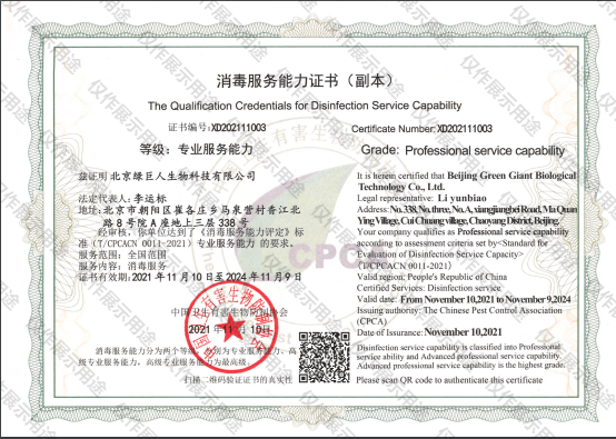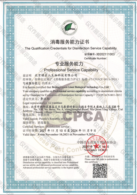 2021年11月12日,北京綠巨人獲得由中國有害生物防制協(xié)會(huì)頒發(fā)的《消毒服務(wù)能力證書》,這是繼獲得《出入境檢疫處理單位核準(zhǔn)證書》之后,北京綠巨人在消毒領(lǐng)域所獲得的又一專業(yè)認(rèn)可。